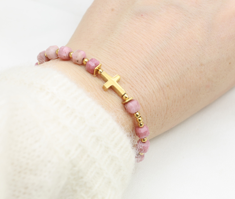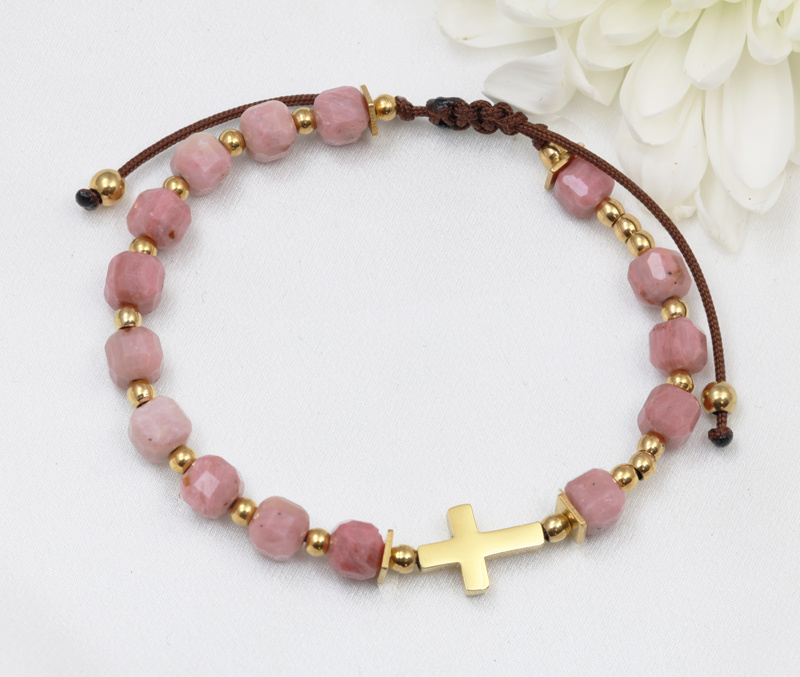 Bransoletka różaniec z krzyżykiem różowy - kostki rodonitu 1877/9