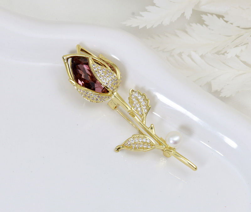 Złocona broszka róża zdobiona kryształem i cyrkoniami 1885/1