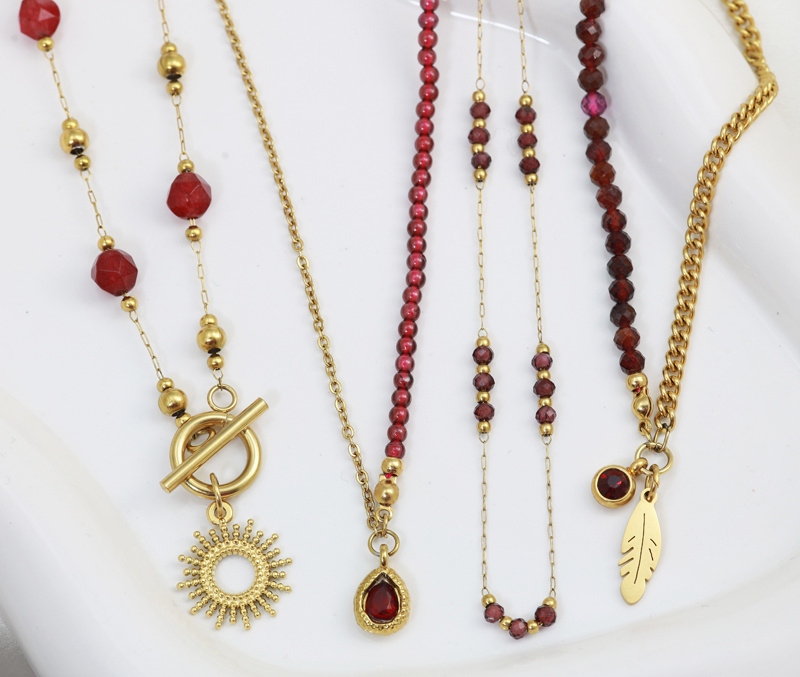 Odkryj odkryj wyjątkowy naszyjnik łączący w sobie trwałość stali szlachetnej i głębokie, bordowe odcienie naturalnych kamieni. To połączenie tworzy biżuterię, która emanuje ciepłem, elegancją i delikatną zmysłowością.