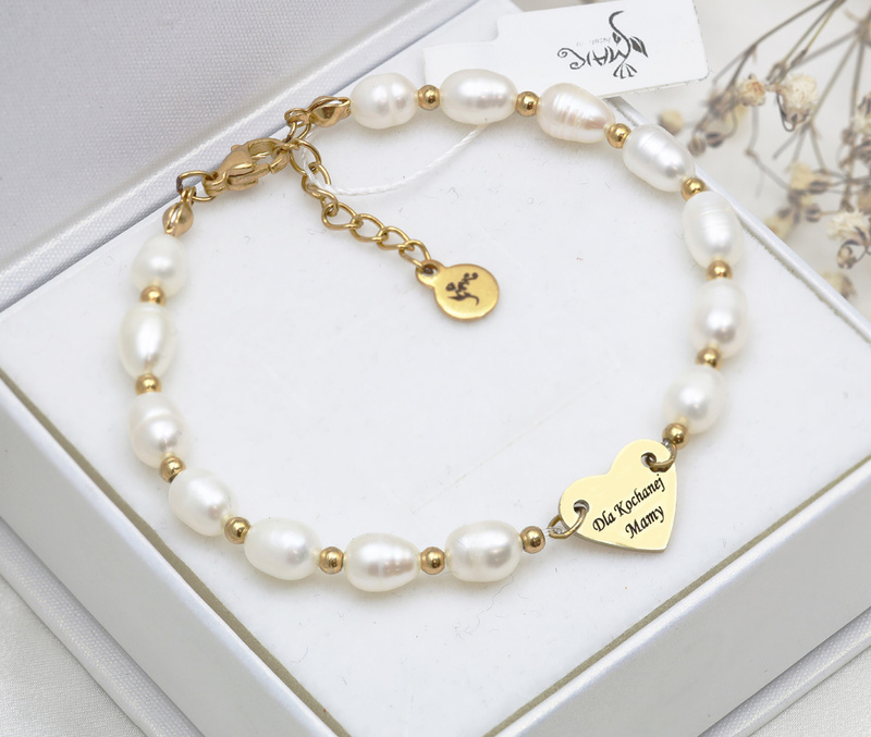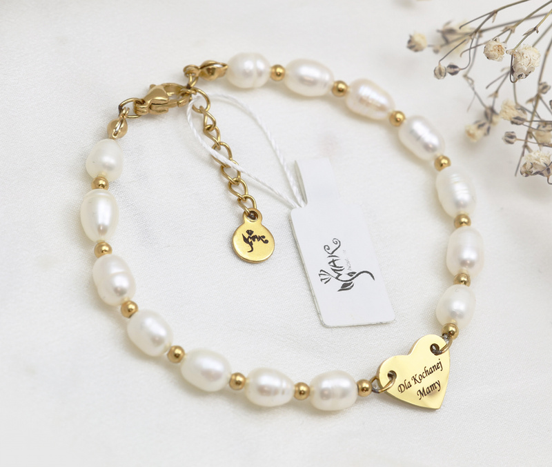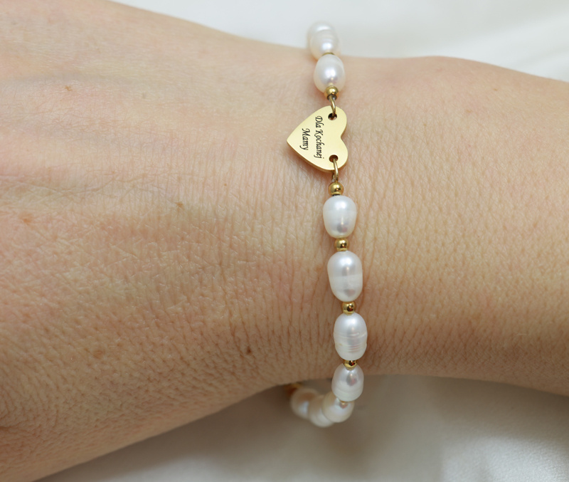 Delikatna bransoletka grawerowana z perłami hodowlanymi i serduszkiem pod grawerunek.