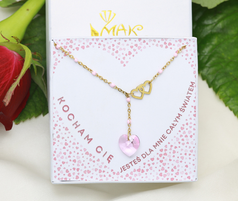Naszyjnik ze stali szlachetnej z ekskluzywnym kryształem Swarovski Elemetns oraz łącznikiem w kształcie połączonych serc. Delikatny naszyjnik w odcieniach różu z symbolami miłości, zapakowany w pudełeczko z dedykacją. Idealny zestaw do wręczenia na Walentynki, rocznicę czy inne ważne okazje. Powiedz Kocham w wyjątkowy sposób biżuterią, która zostanie wspaniałą pamiątką na długie lata.