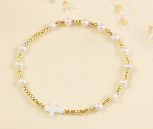1631/10 bransoletka różaniec na sznureczku z koralikami i krzyżem z masy perłowej