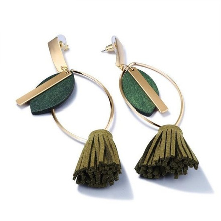 Chwilowo niedostępnyKol 599/757 KOLCZYKI khaki, wiszące z frędzlami, drewniany element