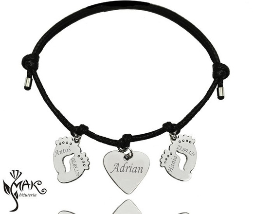 BR959 BRANSOLETKA z grawerem na sznureczku stópki serce