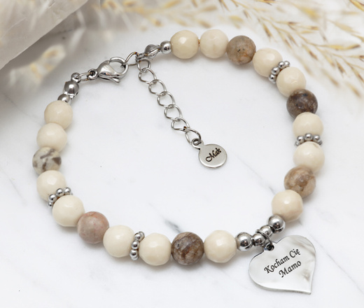 1746/6 beżowa bransoletka z kamieniami naturalnymi i grawerem dla babci zestaw