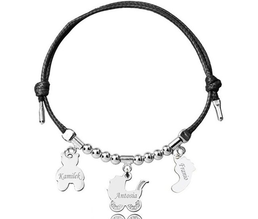 BR962 BRANSOLETKA Z GRAWEREM srebrna na sznurku wózek, miś, stópka