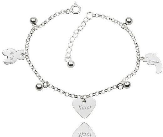 BR962 BRANSOLETKA Z GRAWEREM srebrna na sznurku wózek, miś, stópka