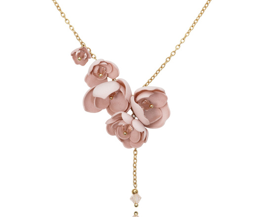 asymetryczny naszyjnik pozłacany z kwiatuszkami i kryształami handmade pudrowy róż 1816/3
