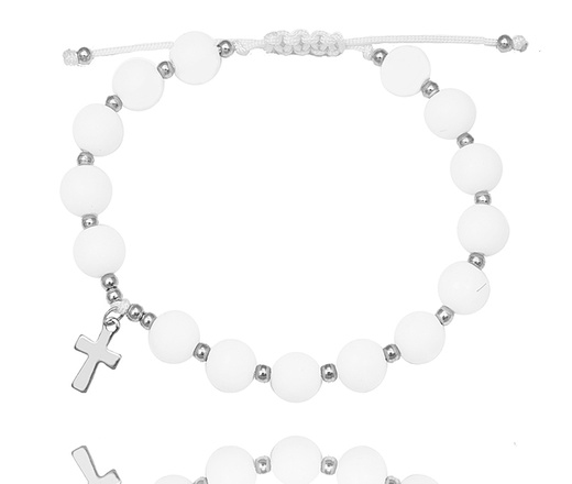 1571/13 bransoletka różaniec srebrna na sznureczku z porcelanowymi koralikami i krzyżem
