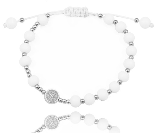 1571/12 bransoletka różaniec srebrna na sznureczku z porcelanowymi koralikami i krzyżem benedyktyńskim