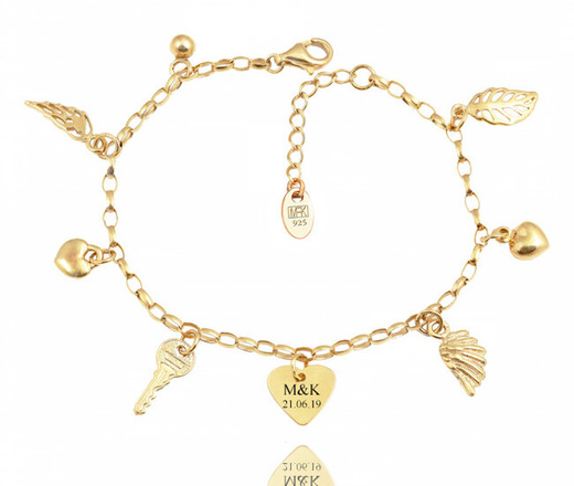 1557 bransoletka srebrna 925 pozłacana z zawieszkami serce skrzydło klucz