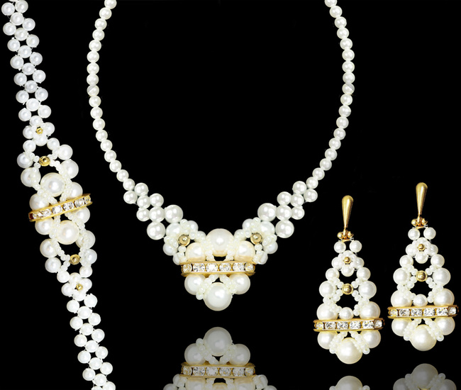 1361 komplet srebrny pozłacany z perełkami i kryształkami