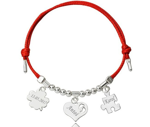 BR962 BRANSOLETKA Z GRAWEREM srebrna na sznurku serce, koniczynka, puzzel