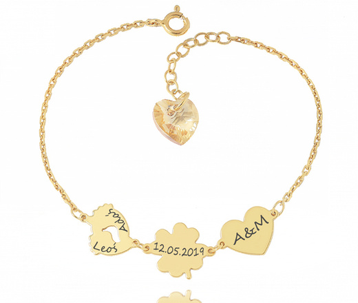 1481 bransoletka srebrna 925 złocona z grawerem koniczynka serce stopki