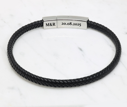 Bransoletka męska z grawerem czarna skóra 1858/3 sześć przekładek