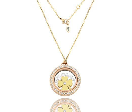 1587 naszyjnik złoty z grawerem stal szlachetna puzderko z cyrkoniami i koniczynką
