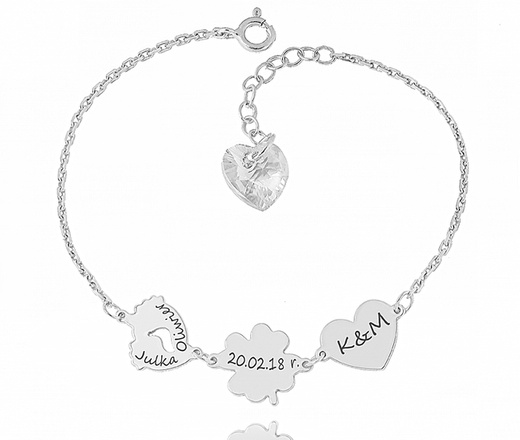 1481 bransoletka srebrna 925 z grawerem koniczynka serce stopki
