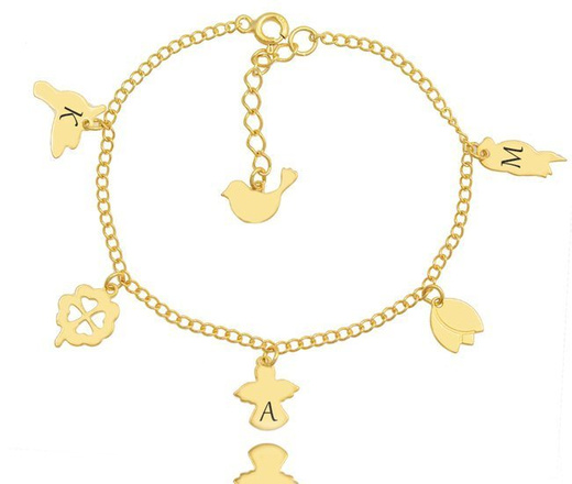 1197 bransoletka grawerowana z zawieszkami serce srebro 925 pozłacane ptaszki koniczynka